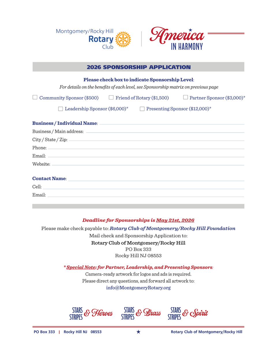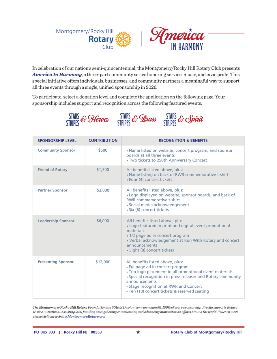 Proceeds benefit the Montgomery-Rocky Hill Rotary Foundation, Inc., a 501(c)(3) nonprofit dedicated to educational, charitable, and humanitarian efforts locally and globally. Sponsorship fuels scholarships, community assistance, disaster relief, and service projects that make a measurable difference.